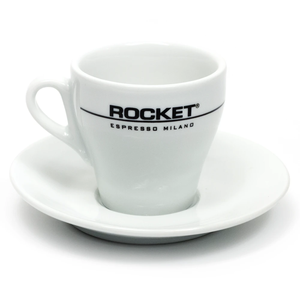 For those looking to complete their Rocket Espresso home cafe, this pair of striking porcelain espresso cups flaunts a flat white look and holds up to 4 fluid ounces and features the proud Rocket logo on the side.